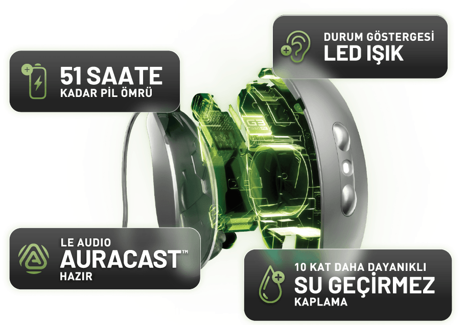 Su geçirmez*, günlük kullanıma uygundur ve günlük kullanım için tasarlanmıştır. Üstelik tüm bunları, benzersiz işitme ihtiyaçlarınıza göre uyarlamıştır.
